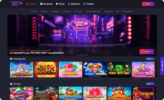 SuperGra Casino – це українське ліцензійне онлайн-казино з крутими місіями для гравців. На проєкті ви побачите низку захоплюючих турнірів, акцій, лотерей з реальними призами для гравців. SuperGra Casino гарантує своїм гравцям безпеку та надійність. На проєкті ви знайдете найкращих слот-провайдерів: 3 Oaks, Playson, Pragmatic Play, BGaming, Play'n'Go, Pushgaming, PGsoft, Endorphina, Platipus, 1spin4win, Wazdan, та багато інших всесвітньо відомих постачальників ігор. Також SuperGra Casino пропонує низку лайв-дилерів з іграми блек-джек, рулеткою, покером, баккарою та іншими. Саме тут гравці отримують незабутні враження та виграші щодня, щотижня, щомісяця!